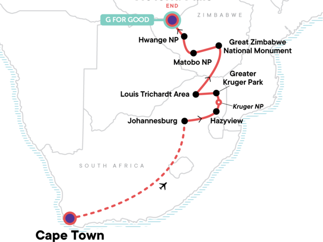 Your Welcome Moment: Meet Your CEO and Group. Soweto township bicycle tour. Panorama Route drive. Kruger National Park wildlife safari drive in our vehicle (full-day). Traditional dance experience. Great Zimbabwe National Monument visit. Nature walk (Matobo National Park). Victoria Falls visit. Border-crossing support. All transport between destinations and to/from included activities.
