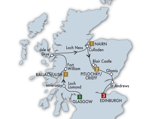 Embark on a cruise of Loch Lomond to appreciate the beauty of this famous loch and admire panoramic views. Browse around Inveraray and have lunch on your own before taking a guided tour of Inveraray Castle, featured in “Downton Abbey.” Journey across Rannoch Moor and through Glencoe, often considered one of Scotland’s most beautiful places. Continue to Ballachulish on the shore of Loch Leven. (B, D)