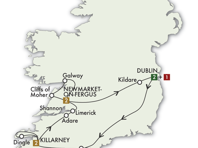 Discover the glorious Dingle Peninsula, made famous in the movies “Ryan’s Daughter” and “Far & Away,” which showcased the wonderful scenery found here. Travel to Slea Head at the westernmost tip of the peninsula for awesome views of the Atlantic Ocean, and stop for a while in charming Dingle town. Or you may choose to do the Ring of Kerry, perhaps Ireland’s best known scenic drive. Either way, you’ll experience spectacular seascapes and charming villages, with plenty of photo stops along the way. Visit Muckross Schoolhouse, a replica schoolhouse from times past, for a fun evening of traditional entertainment over dinner. (B, D)