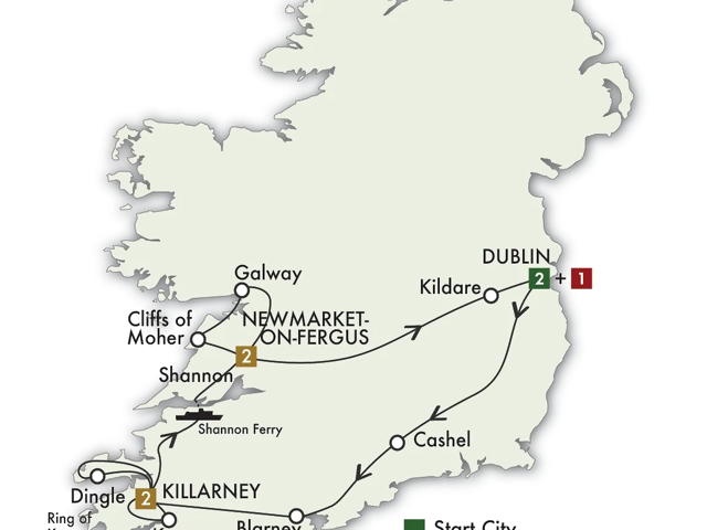 Discover the spectacular vistas of the Dingle Peninsula and its rugged coastline. See scenic Slea Head before going to the friendly town of Dingle for some free time. Depart Dingle, take a ferry across the Shannon Estuary, and arrive at your hotel in County Clare. This evening, dine at a medieval-style feast, where lords and ladies will serenade you with songs and music from days of yore. (B, D)