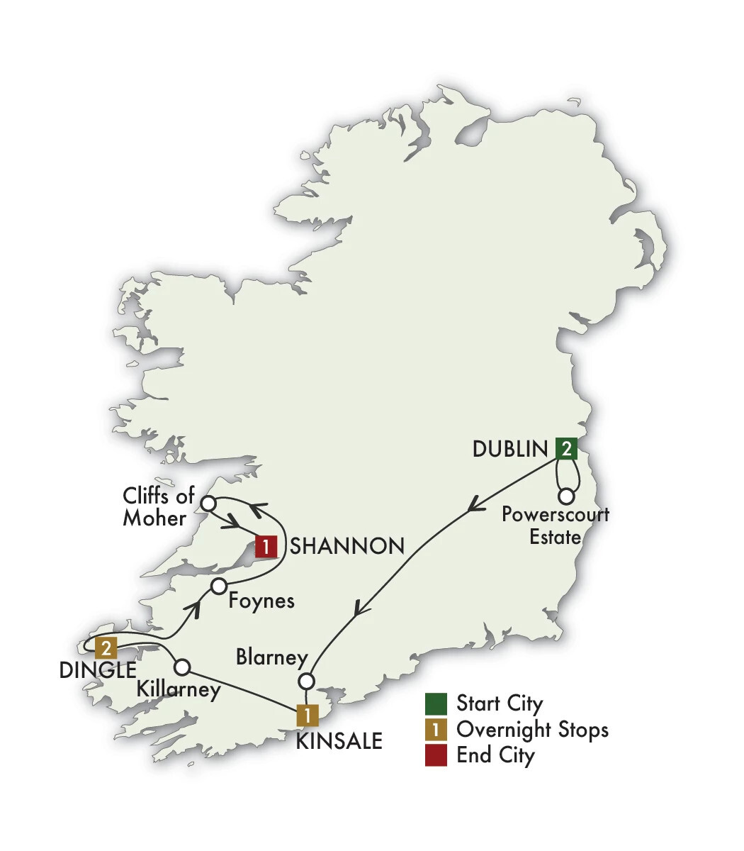 Travel to Blarney Castle; climb the winding staircase to kiss its famous stone or enjoy the gardens. Go to Kinsale, a picturesque old fishing town known for art galleries and gourmet food. Join a local guide for a fascinating walk around its historic streets, once besieged by the Spanish Armada, before dinner at your hotel. (B, D)