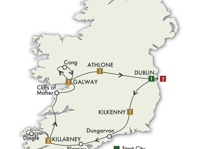 Drive through Connemara to Cong for a visit to the Quiet Man Museum, an exact replica of the charming, thatched cottage in the classic film. Take a stroll around the village on a guided walking tour and see the original movie locations. Next, travel on to Athlone to raise a pint at Sean’s Bar, Europe’s oldest pub, dating back to 900 AD. The sloped, often sawdust-covered floors and open fires pay nostalgic tribute to this pub’s rich history. Dine at your hotel. <(B, D)