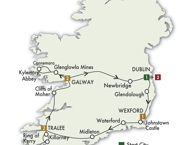 Set off for Glendalough, a valley in the beautiful Wicklow Mountains. Tour the picturesque ruins of the ancient monastery there; it thrived for centuries after being established by St Kevin in the sixth century. See stone churches, large carved Celtic crosses, and an iconic round tower. Next, visit luxurious Johnstown Castle in Wexford for a tour of the Gothic Revival castle and its splendid gardens, designed by one of the 19th century’s leading architects. Dine with your group at your hotel. (B, D)