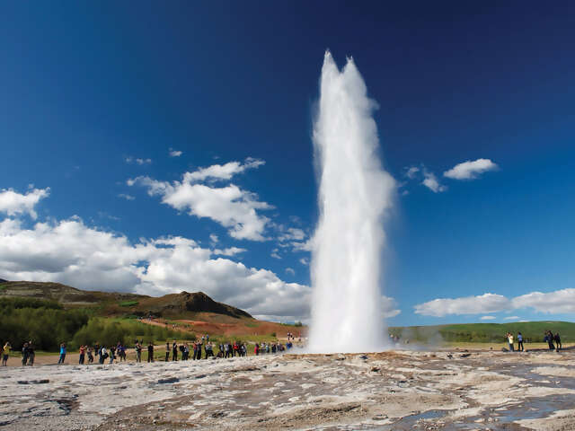 See some of Iceland’s must-sees along the famed Golden Circle. Visit the spectacular Gullfoss Waterfall, with its two separate drops, then go on to Geysir to see the Strokkur geyser, erupting every few minutes. Head on to Þingvellir, a national park where the North American and Eurasian tectonic plates meet, and where the world’s oldest parliament began. Finish your day with a soak in the geothermal waters of the Blue Lagoon. Return to Reykjavík and enjoy an evening free to explore. (B)