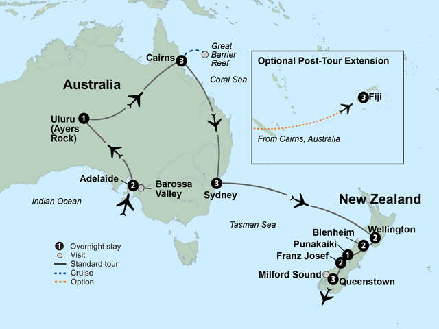 From Uluru's glowing sunset and the Great Barrier Reef, to Maori traditions, discover Australia and New Zealand's soul-stirring wonders. Savor sparkling wine and canapés at sunset in the Outback, a hangi hangi lunch in Wellington, and vineyard fare in Marlborough. Cruise through Milford Sound's dramatic fjords, explore Sydney's icons, and connect with Aboriginal and Maori traditions through immersive storytelling and ceremony. With unforgettable culinary moments, wildlife encounters, and walks through rainforests and glaciers, take a journey that celebrates connection, nature and the joy of discovery.