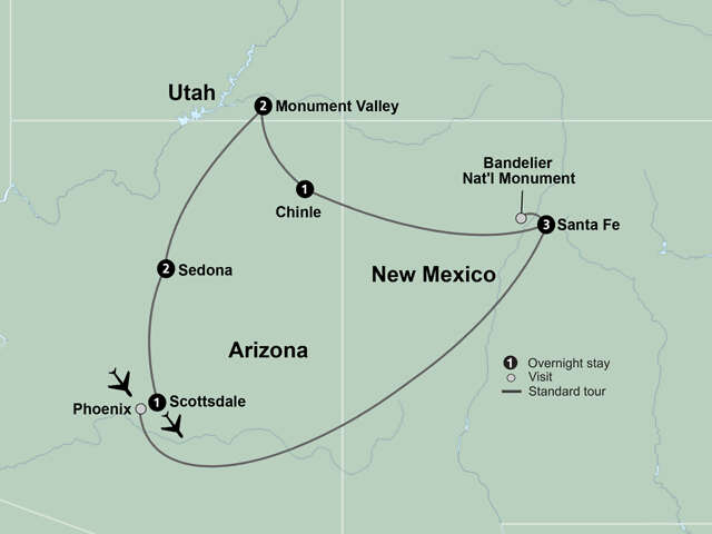 Journey through the American Southwest’s storied landscapes, where striking canyons and red-rock formations are woven with ancestral histories and enduring Indigenous traditions. Get to know Santa Fe’s historic plaza on a locally guided walking tour, and explore Bandelier National Monument, home to cliff dwellings and village ruins from Ancestral Puebloans. Visit the mesa-top Acoma Pueblo, continuously inhabited for nearly 1,000 years. Within Navajo Nation, take in the painted hues of Canyon de Chelly as your Navajo guide shares stories and history. Marvel at the towering monoliths of Monument Valley, and savor a traditional BBQ dinner under desert skies. Stay in Sedona and Scottsdale, two lively cities nestled within desert scenery. From desert cities to ancestral lands, explore the spirit of the region.