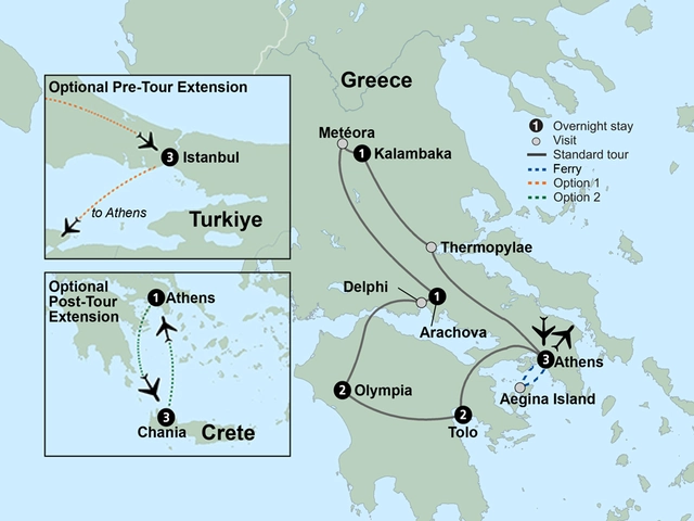 Discover the magnificent ruins of ancient Greece in their tranquil Mediterranean settings. This comprehensive journey explores Greece's most important ancient monuments, like the famed Temple of Zeus, the archaeological site of Olympia, and ancient artifacts of Delphi. Explore Athens on a comprehensive tour of the incredible Acropolis. Take the ferry to Aegina Island for a day with free time to soak up Greek island life. Visit a local farm in the countryside to see how olive oil and wine are produced. Learn how to cook traditional Mediterranean cuisine during a cooking demonstration. Learn the history of this fascinating country from local experts on guided tours of Athens, Metéora, Delphi, and Olympia. This well-paced journey balances expeditions to Greece’s important historic sites with ample time to explore on your own.