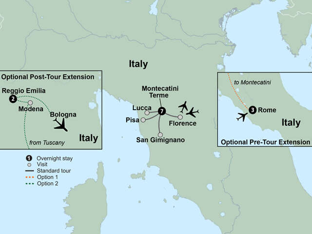 Your tour opens in the famous spa resort town of Montecatini Terme, nestled in the heart of the rolling hills of Tuscany. As travelers’ arrival times will vary, we have not included any sightseeing today. Spend the day as you wish, exploring the town independently. This evening, get to know your fellow travelers during a welcome dinner where regional foods and Italian wines kick off your adventure.