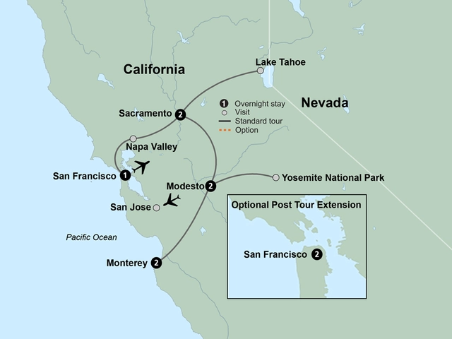 This is the essence of Northern California, from fine wine and freshly caught seafood to vibrant cities and nature on an epic scale. Discover Monterey’s Fisherman’s Wharf, Old Sacramento and Pier 39 in San Francisco. Witness the stunning views along 17-Mile Drive. Meet a local farmer and visit an almond orchard. Enjoy an olive oil tasting and lunch during an informative presentation. Marvel at the unspoiled beauty of Yosemite National Park. Glide on the pristine waters of Lake Tahoe on a classic yacht. Sip local wines in Napa Valley and enjoy a farm-to-table lunch. Embrace the laid-back life of the Golden State.