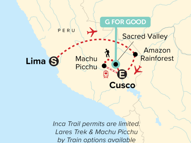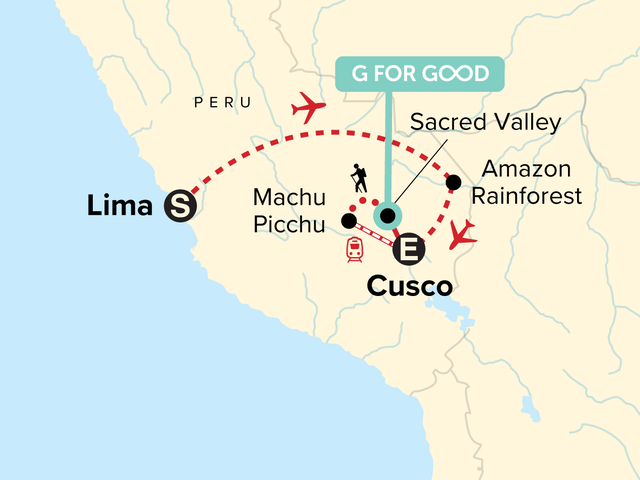Your G for Good Moment: Handmade Biodegradable Soap Products. Arrival transfer. Three-day (2 nts) excursion to the G Adventures intimate rainforest lodge. Sacred Valley tour. Choice of four-day Inca Trail hike with local guide, cook, and porters or Cusco/Aguas Calientes stay with scenic train. Guided tour of Machu Picchu. Internal flights. All transport between destinations and to/from included activities