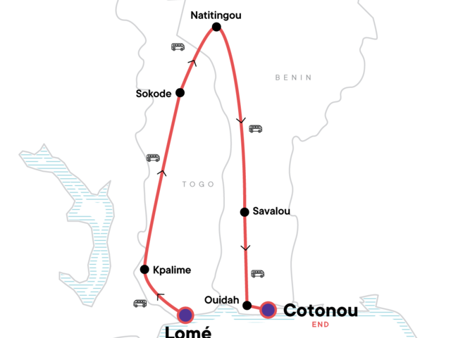 Your Hands-On Moment: Atitovou Community Visit & Kente Cloth Weaving, Atitovou. Arrival transfer. Grand Marche and German Cathedral Visit. Atitovou Community Visit & Kente Cloth Weaving. Mount Kloto Visit & Hike. Atakpame Markets. Sokodé Horse Dance. Sokodé's Traditional Fire Dance. Traditional Fugu Weavers of Bafilo. Iron Smelting at Tsare Community. Koutammakou UNESCO World Heritage Site Visit. Fulani Village Visit. Tata Somba Village Visit & Walk. Organic Shea Butter Process with a Local Family. Visit the Regional Museum in Natitingou. Teneka Beri Mountain Community Visit. Dankoli Shrine Visit. The Gelede Masked Dance. Visit the Underground Dwellings. Chameleon Temple Visit & Private Palace Walkthrough. Kokou Ceremony & Lake Nokoue Visit. Amazone Statue in Cotonou. Walking tour of Grand Marché du Dantokpa. All transport between destinations and to/from included activities.